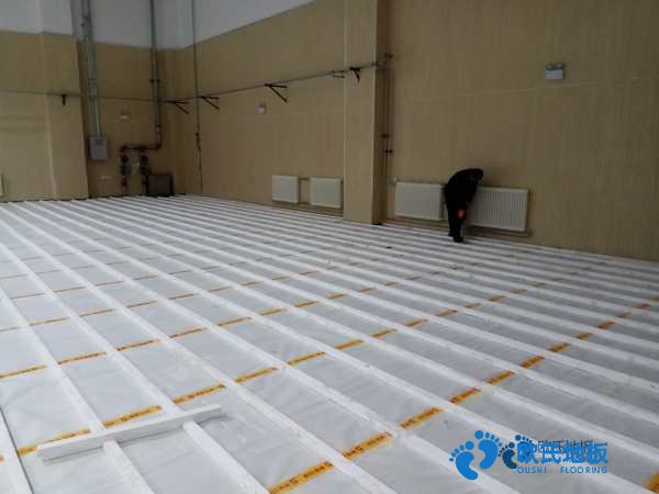 但不能防止木龍骨和空氣中的水分對地板產生的危害,有時也會產生問題。如果木龍骨是經過干燥的,地板的含水率又與使用環境的平衡含水率相近,就不會有問題。因此,在《木質地板鋪裝工程技術規程》CECS2005中可以用此方法。因為工程項目,一次用的實木地板比較多,地板的含水率必須滿足設計要求,在工程設計時就要求地板的含水率應與使用環境的平衡含水率相適應。而在體育木地板生產廠家良莠不齊的情況下,客戶可能都對每一塊地板的含水率進行檢測,這就很難保證不出問題。所以,在新頒布的1標準GB/T木質地板鋪裝、驗收和使用規范中,不允許此方法。將防潮膜鋪在木龍骨上面,這種方法缺點是防潮膜很難抻平,防潮膜在木龍骨上面呈現波浪形。