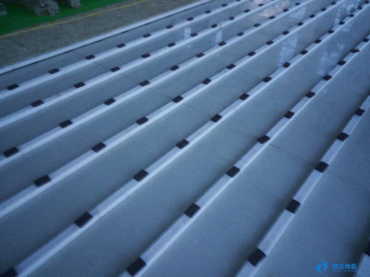 2、運動木地板彈性墊安裝:之所以安裝位置要準確,是因為彈性墊是保證運動木地板震動吸收的關鍵構件。為了保證整個運動木地板系統性能均勻,本系統彈性墊塊裝在了龍骨背面。