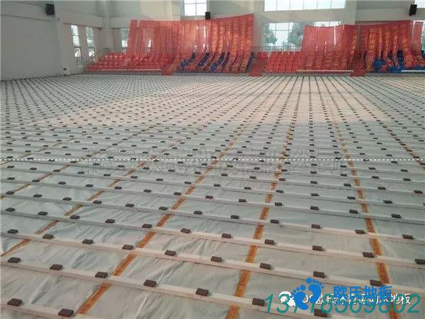 2、承載層:承載層可采用單龍骨或雙龍骨做法,通常需要使用防腐劑進行防腐處理。龍骨間距一般設置為400mm。根據是否將龍骨與地面做固定以及采用何種固定方式,可將體育木地板分為懸浮式系統,固定懸浮式系統和固定式系統。